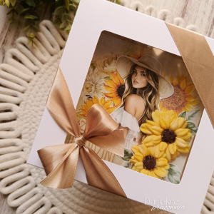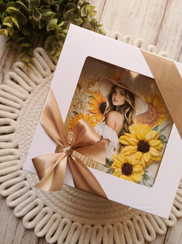 - Pudełko przewiązane wstążką w kolorystyce pasującej do wnętrza kartki.
