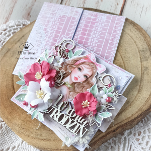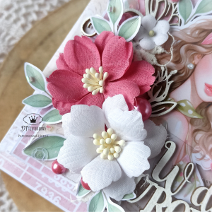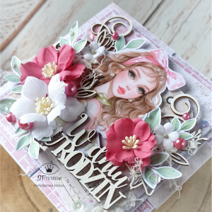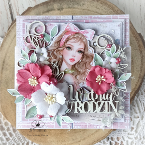 Idealna dla kobiety, która kocha subtelność, elegancję i pastelowy urok z nutą artystycznego sznytu. Ta wyjątkowa kartka to połączenie romantycznego stylu i delikatnych detali. Główną ozdobą jest ilustracja pięknej dziewczyny w stylu fashion z uroczą kokardką we włosach, otoczona kompozycją przestrzennych kwiatów, listków i tekturek. Całość utrzymana jest w pastelowej palecie z akcentami różu, beżu i bieli.