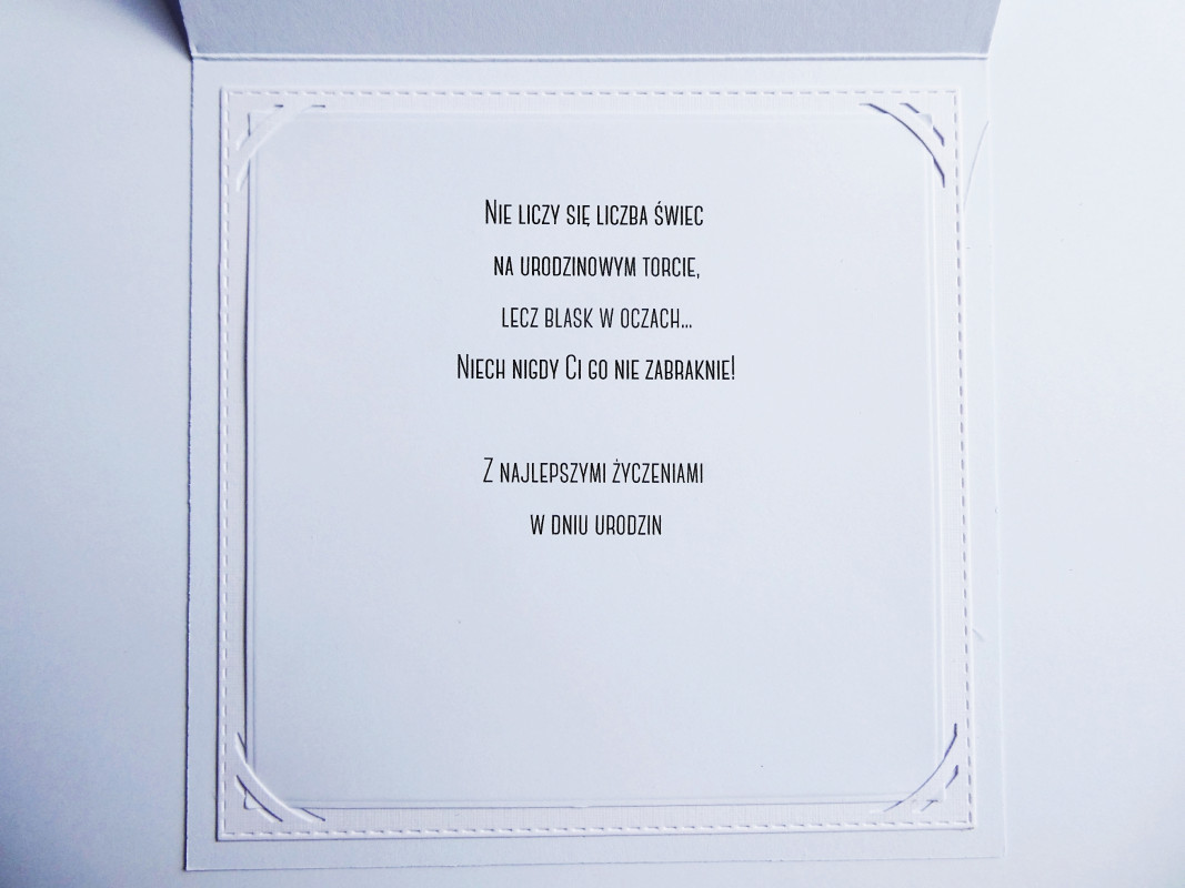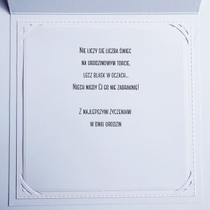 Kartka w środku ma wklejony biały karnecik, w którym umieszczona została wkładka z życzeniami.