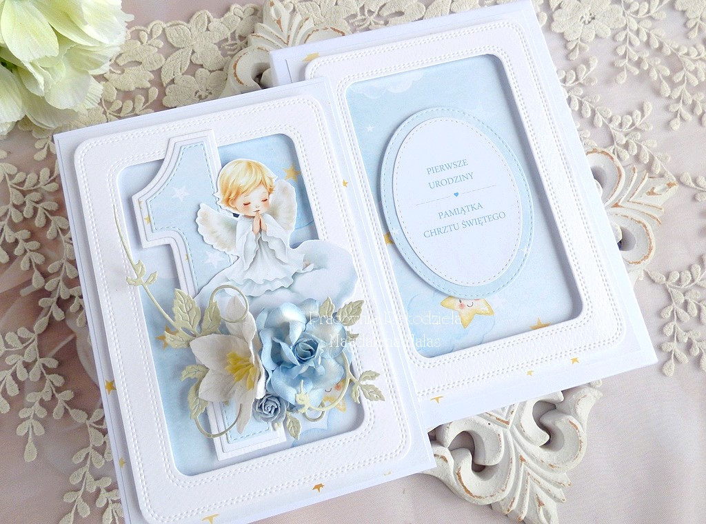 Warstwowa kartka z okazji Chrztu oraz 1. Urodzin ozdobiona ślicznymi papierami scrapowymi polskich producentów, grafiką aniołka, kwiatami oraz innymi dodatkami.