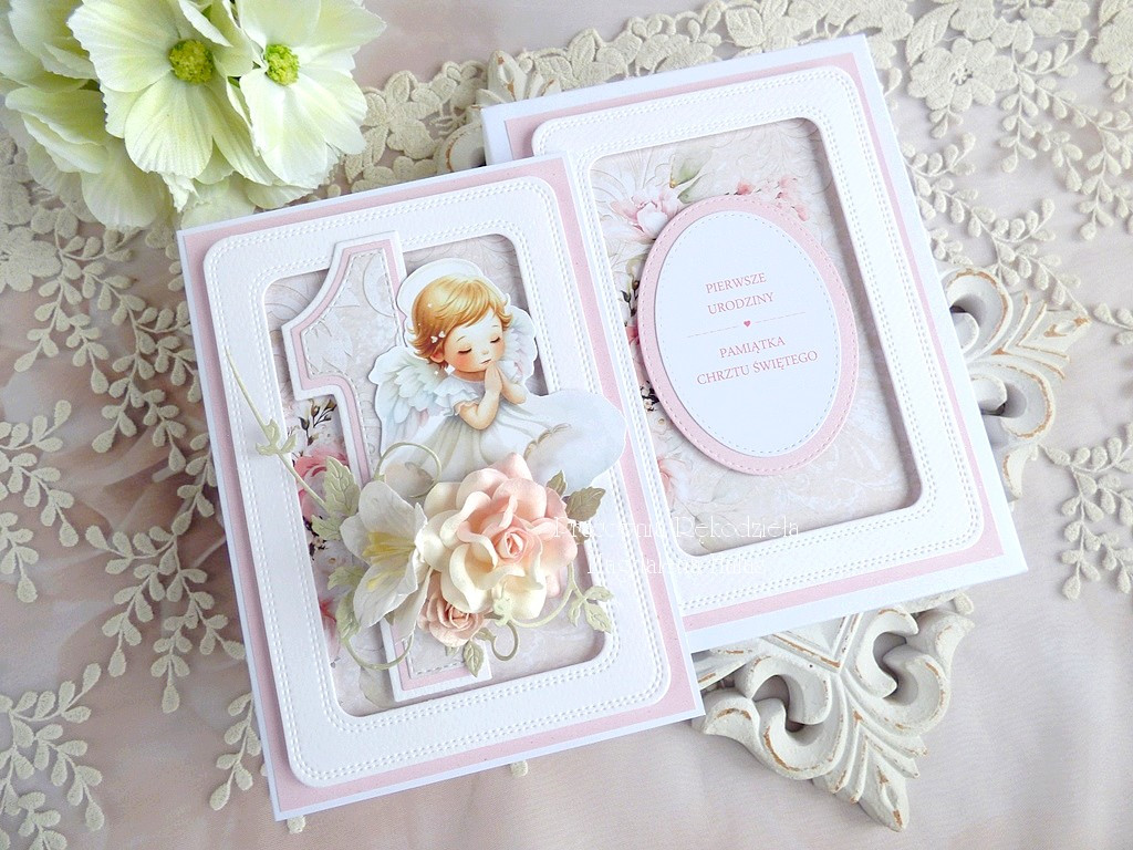 Warstwowa kartka z okazji Chrztu oraz 1. Urodzin ozdobiona ślicznymi papierami scrapowymi polskich producentów, grafiką aniołka, kwiatami oraz innymi dodatkami.