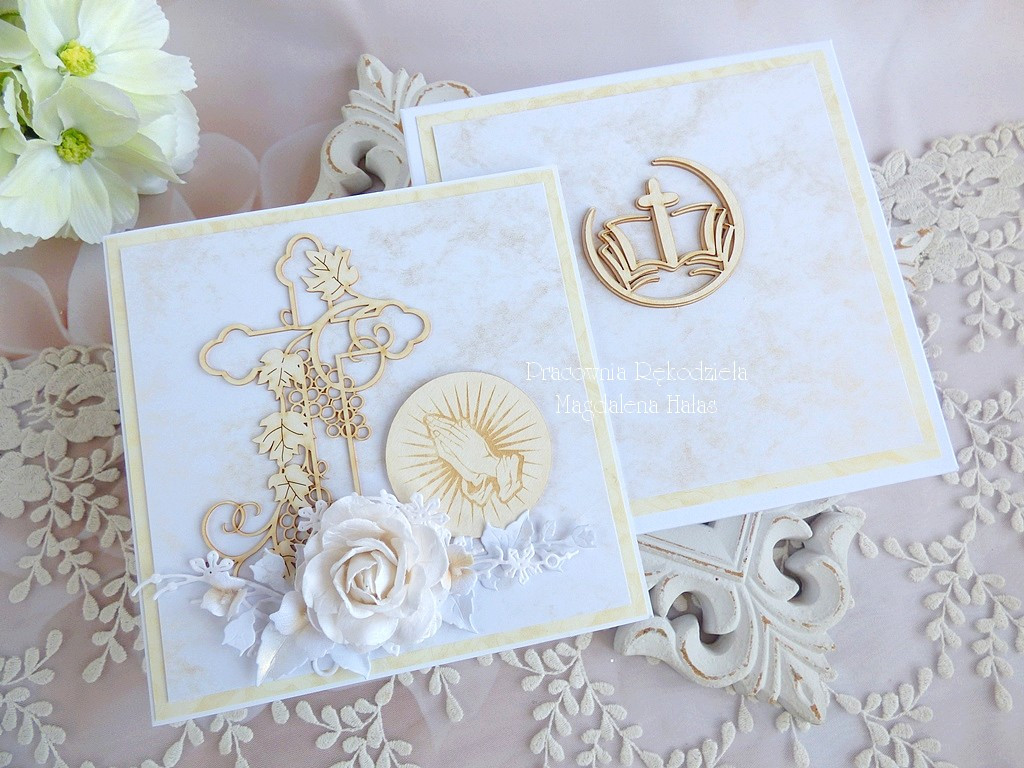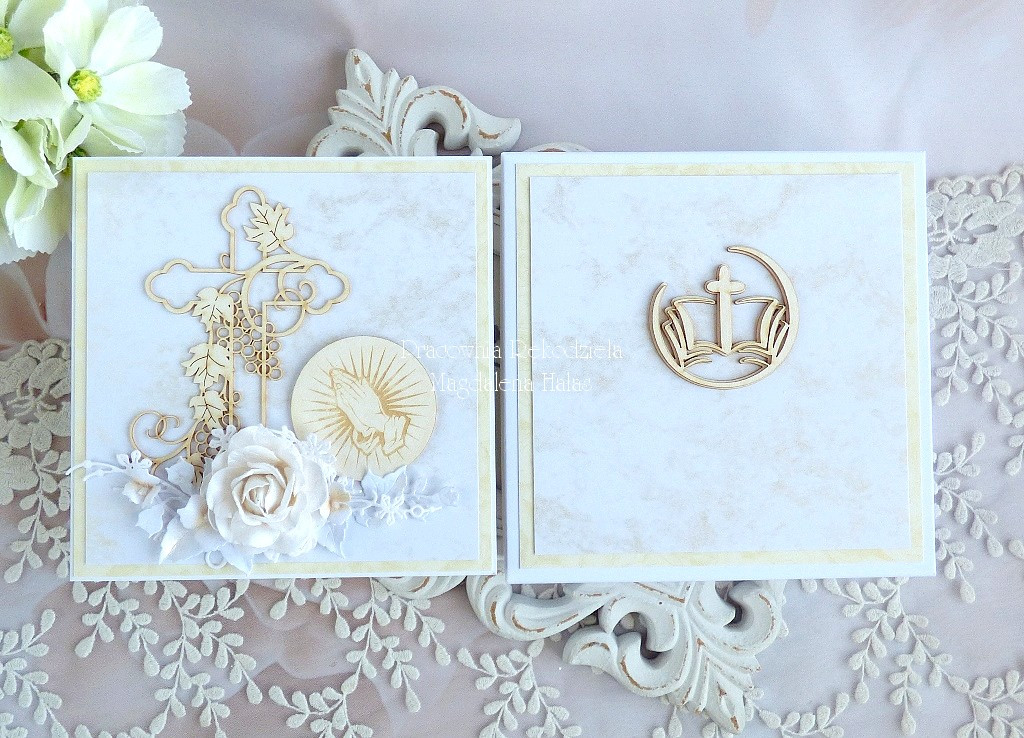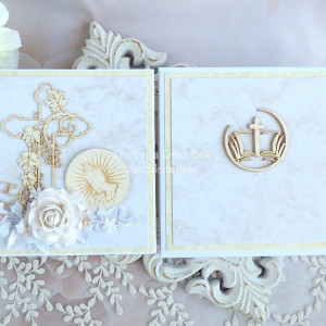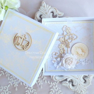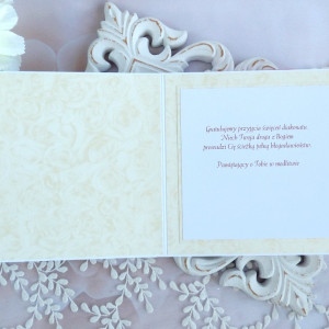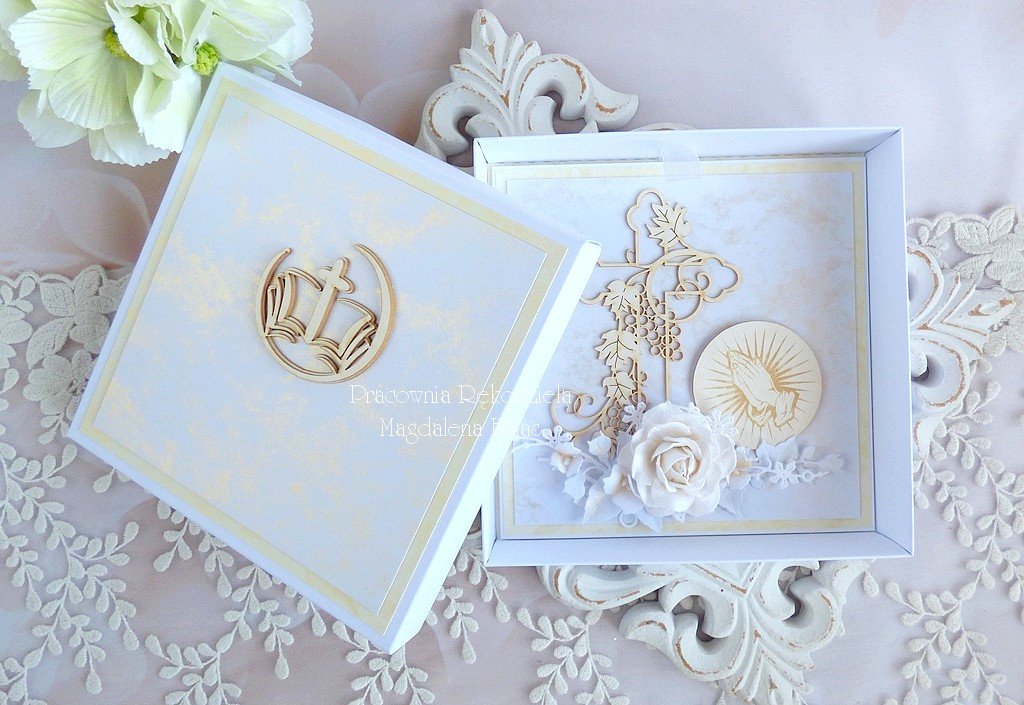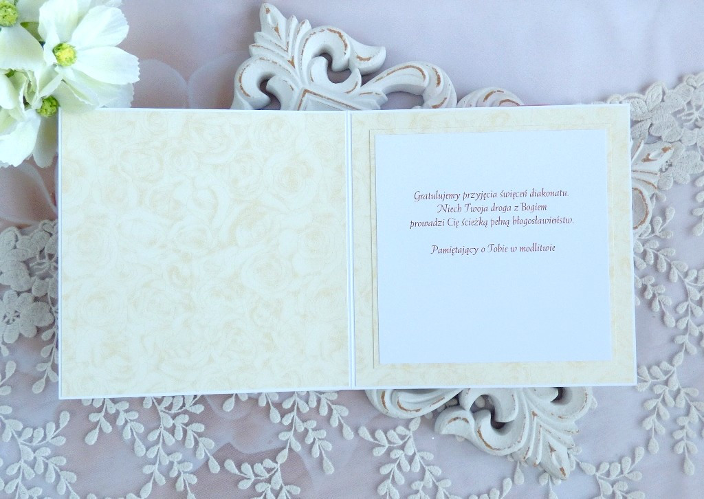 Warstwowa pamiątka z okazji Święceń Diakonatu, ozdobiona pięknymi papierami perłowymi polskiego producenta, laserowo wycinanymi tekturkami oraz kwiatami
