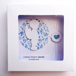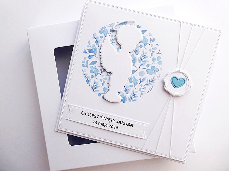 Niezwykle subtelna i delikatna - z oryginalną grafiką w niebieskim kolorze, wyciętą z papieru postacią aniołka-chłopczyka i dekoracyjnym sznurkiem ozdobionym papierową pieczęcią z sercem.