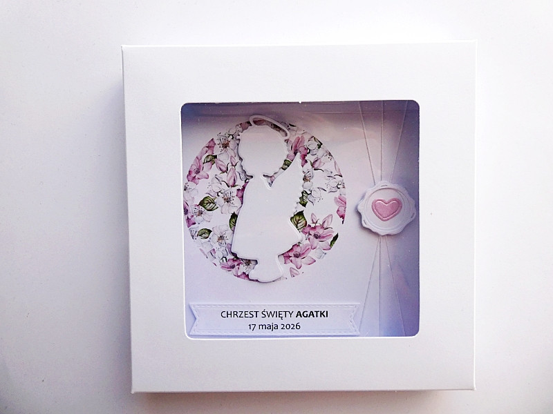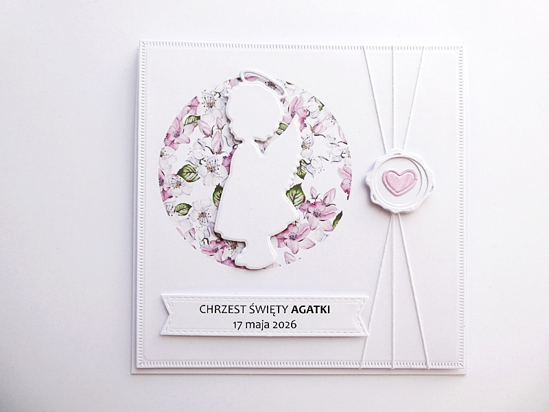 Pastelowa - przyozdobiona delikatną kwiatową grafiką i wyciętą z papieru postacią aniołka-dziewczynki, a także dekoracyjnym sznureczkiem oraz papierową pieczęcią z sercem.