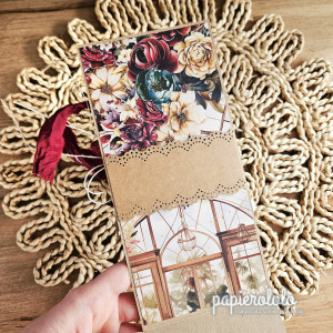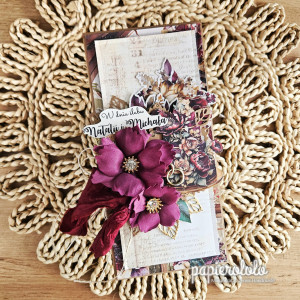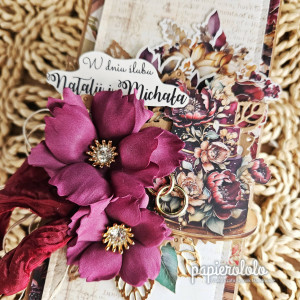 Szczegóły: Kartka na bazie kraftowym otwierana pionowo. Oklejona papierami scrapowymi i z przygotowaną kieszonką na pieniądze. Główny kolor to połączenie fioletu i purpury. Na froncie tort, obrączki i duże kwiaty z foamiranu.