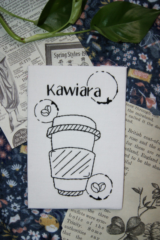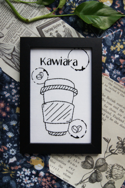 Haft wykonany ręcznie na materiale bawełnianym, usztywniony tekturą o wymiarach 10x15cm. Oprawiony w ramkę z tworzywa MDF. Ramka ma z tyłu haczyk oraz podpórkę, dzięki której możesz wyeksponować ją w dowolny sposób. Choć nie jest widoczna na zdjęciach, do ramki dołączona jest również szklana szybka, która ochroni haft przed uszkodzeniem czy zabrudzeniami.