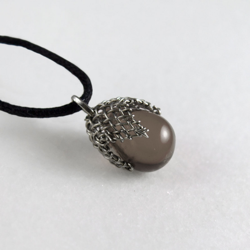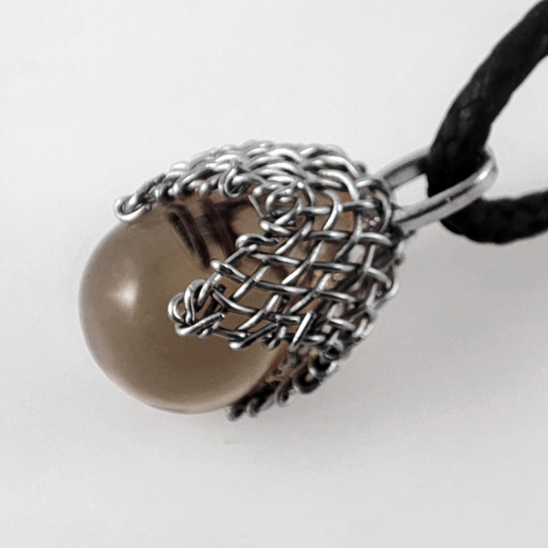 Szklana kropla oprawiona w ręcznie formowaną metalową siateczkę. Całkowita wielkość wisiorka to ok. 2 cm. W komplecie bawełniany sznurek do zawieszenia.