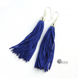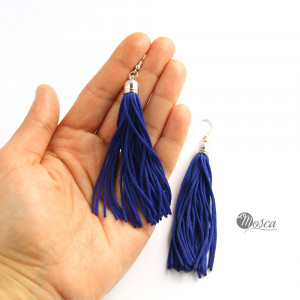 Efektowne kolczyki z frędzlami w kolorze kobaltowego granatu - idealne do karnawałowej lub letniej stylizacji! Sznureczki są miękie, falujące przy każdym ruchu. Kolczyki są wygodne, leciutkie i łatwe w utrzymaniu, frędzle nie są podatne na zagniecenia. Długość kolczyka: ok. 11cm. Bigle są ze stali szlachetnej .