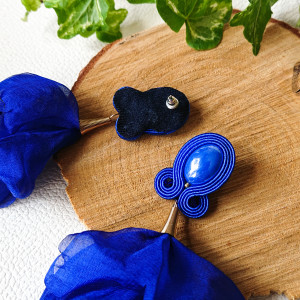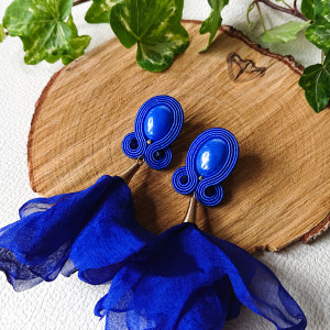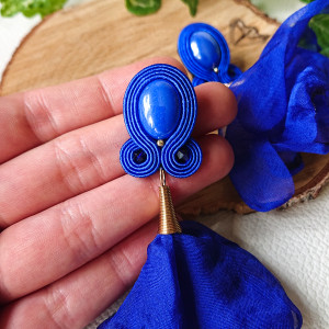 Kobaltowe sztyfty sutasz z zwiewnymi chwostami. Ceramiczne kaboszony otoczone sznurkami sutasz oraz drobnymi fasetowanymi szklanymi kryształkami. Dół kolczyków ozdobiony lekkimi zawieszkami z szyfonu zamocowanych w złotych oprawach. Kolczyki zapinane na sztyfty ze stali chirurgicznej.