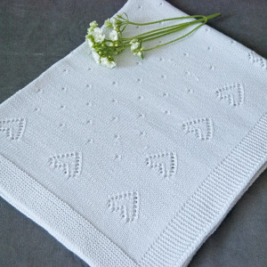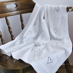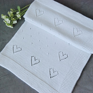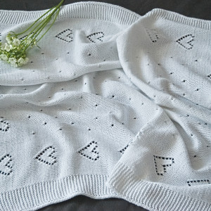 To praktyczny, a przy tym naturalny dodatek do dziecięcego wózka i łóżeczka. Sprawdzi się na spacerze i podczas domowej drzemki. Szczególnie latem. Jest przewiewny i miękki, nie podrażni delikatnej skóry dziecka. Kocyk w całości robiłam ręcznie na drutach, łącząc wg własnego pomysłu kilka wzorów. Ozdobą są ażurowe serduszka wzdłuż brzegów oraz subtelny ażur na środku kocyka. Brzegi to ścieg francuski. Kocyk jest dość duży, więc będzie przydatny przez dłuższy okres, nawet do 3 roku życia dziecka.