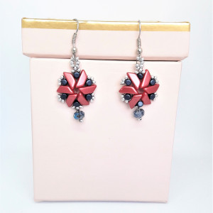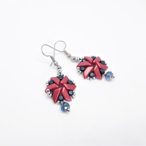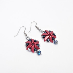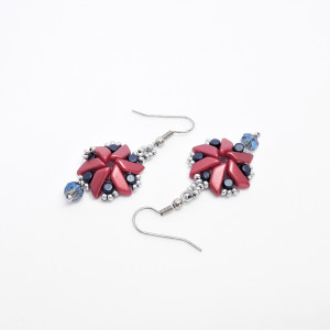 Koraliki Minos par Puca Metallic Dark Blue cylindryczne. Koraliki Tinos par Puca Pastel Dark Coral . Koraliki bardzo drobne szklane w kolorze srebrnym matowym. Kryształek szklany fasetowany niebiesko-dymny. Bigle otwarte z kulką i sprężynką.
