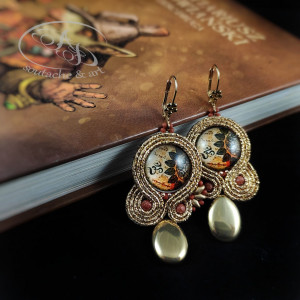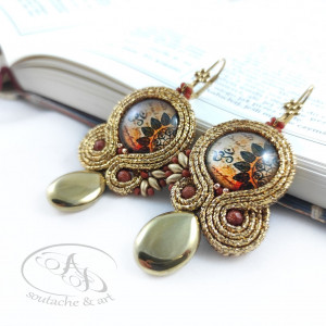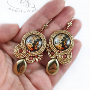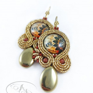 złoty sznurek sutasz, kaboszony szklane, koraliki toho oraz superduo, łezki hematytu w złotym kolorze, złoty materiał brokatowy (tył), bigle angielskie ze stali chirurgicznej w kolorze złotym (bigle mogą nieco różnić się od przedstawionych na zdjęciach)