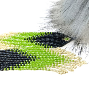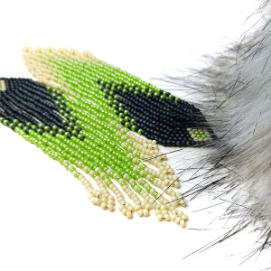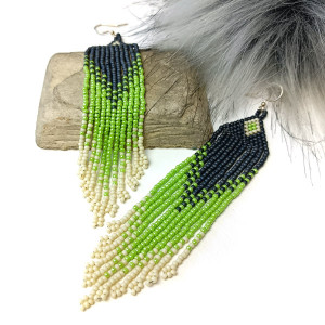 Oryginalne, średniej długości kolczyki wykonane w całości ręcznie z drobnych koralików TOHO w stylu etnicznym w kolorach: grafitowym, zielonym i ecru.