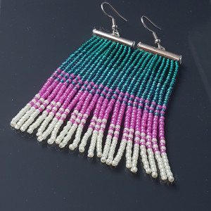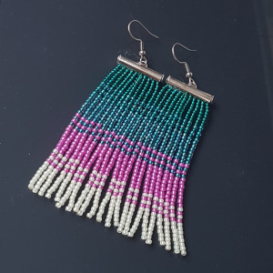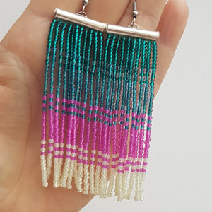 Kolczyki frędzelki w odcieniach zieleni, turkusu, różu, drobne koraliki, bigle stal chirurgiczna w kolorze srebrnym, szerokość 2,2 mm, dlugość kolczyków z biglem 9 cm