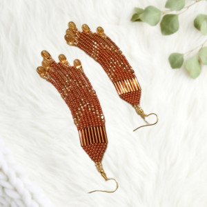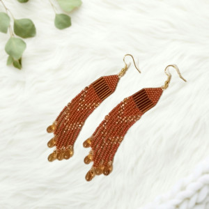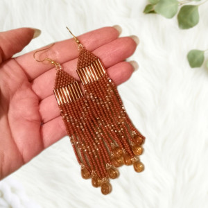 Długie, efektowne kolczyki, w całości wyplecione ręcznie, z drobnych szklanych, japońskich i czeskich koralików. Utrzymane w kolrystyce brązowo-miodowo-złotej. Frędzelki zwieńczone kropelkami w miodowym kolorze, z inkluzjami przypominajacymi kwarc rutylowy. Zawieszone na hipoalergicznych metalowych biglach w kolorze złota.
