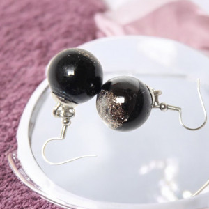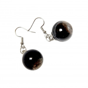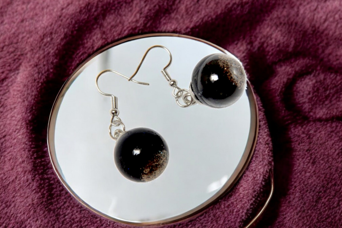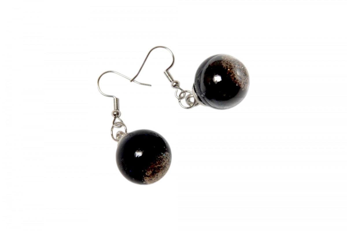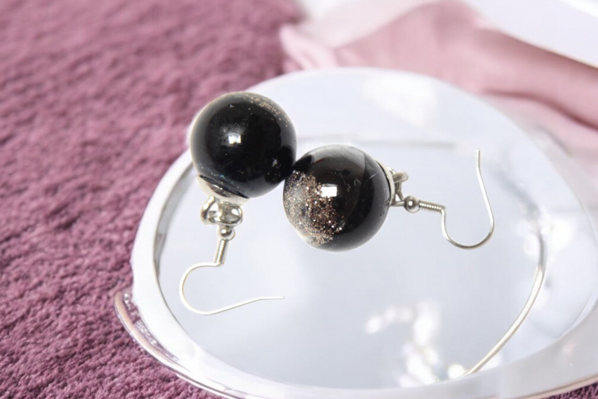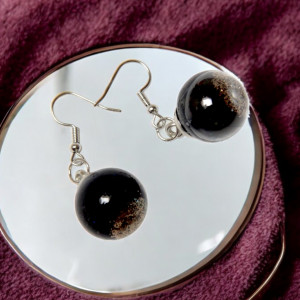 Prezentowana para to szklane kulki, z brokatem zalanym żywicą w kolorze granatowym, prawie czarnym, zawieszone na metalowym kółku w kolorze srebrnym. Zapięcie bigiel otwarty.