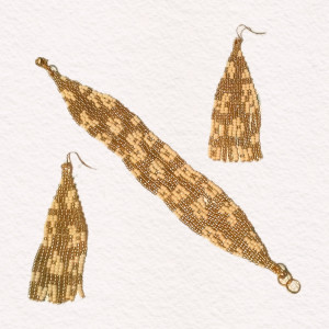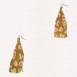 Kolczyki w całości wykonane z wysokiej jakości japońskich koralików Toho w odcieniu złota i beżu. Bigle metalowe w kolorze złotym. Dla miłośniczek frędzelków i bardziej okazałych dodatków. W moim butiku dostepna także bransoletka (widoczna na ostatnim zdjęciu). Wzór własny. Jedyny egzemplarz.