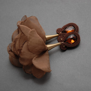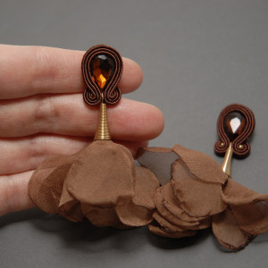 oferuję kolczyki lub klipsy zrobione techniką sutasz, ozdobione fasetowanymi kaboszonami i kwiatkami z materiały