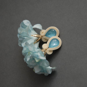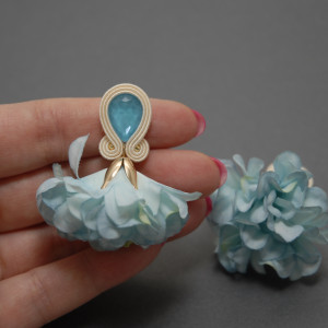 oferuję kolczyki lub klipsy zrobione techniką sutasz, ozdobione fasetowanymi onyksami i kwiatkami z materiału