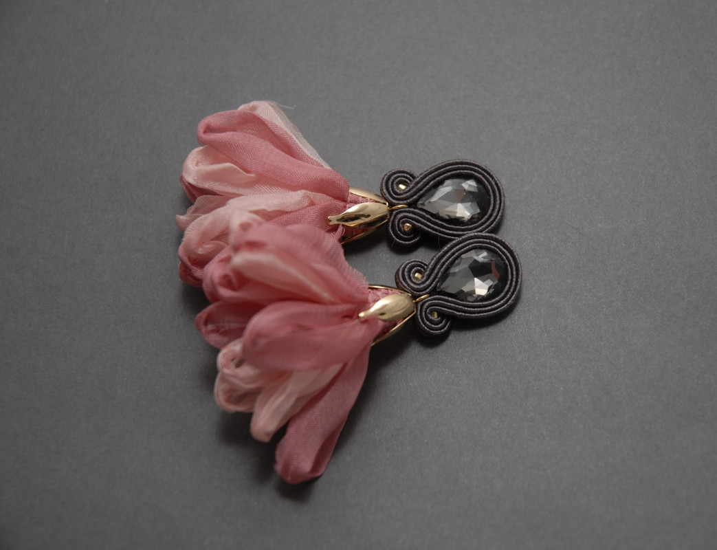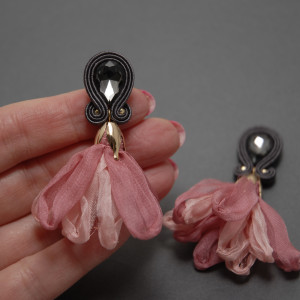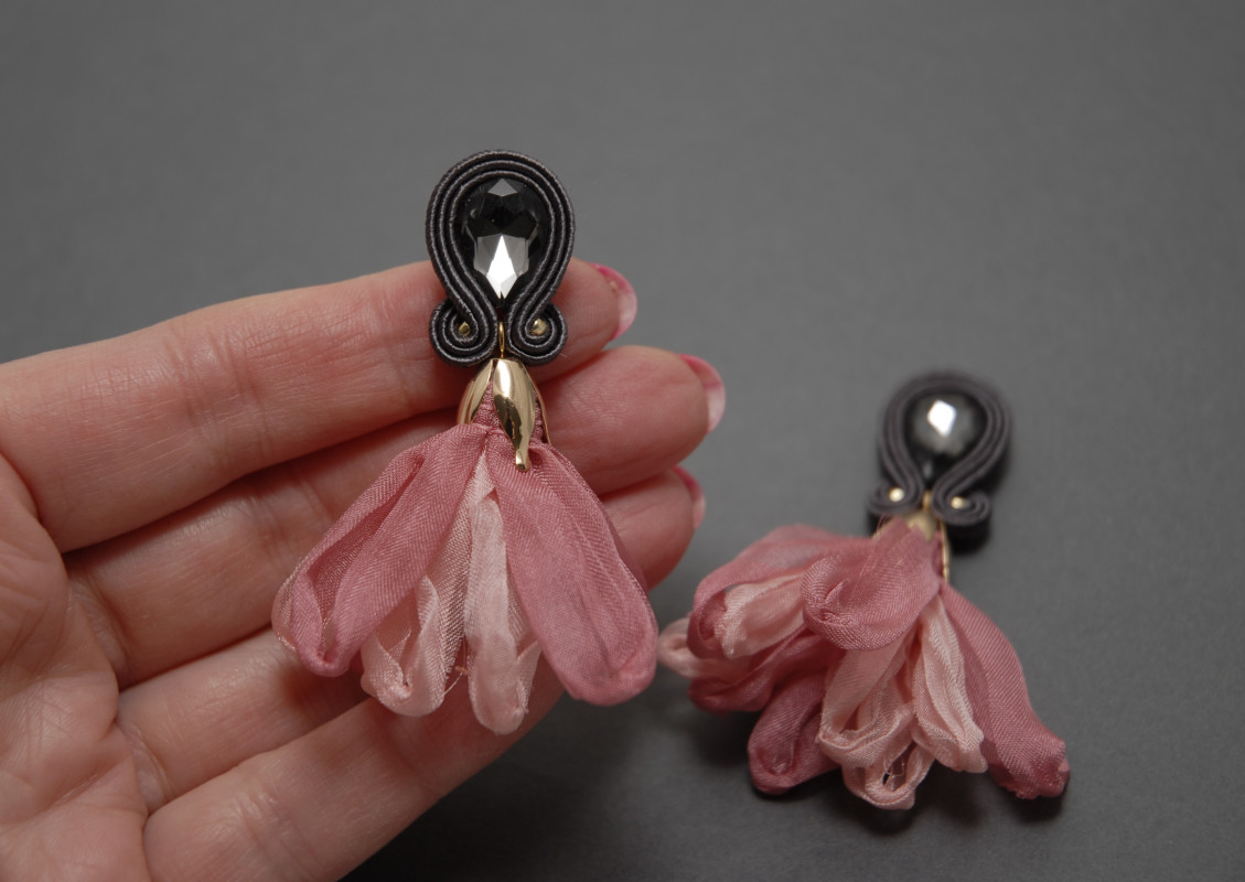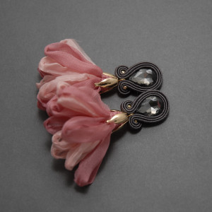 oferuję kolczyki lub klipsy zrobione techniką sutasz, ozdobione fasetowanymi szklanymi kaboszonami i kwiatkami z szyfonu
