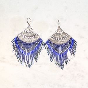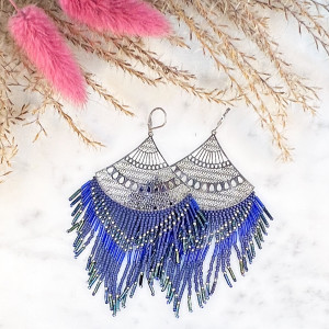 Duże i efektowne kolczyki z koralikowymi frędzlami w kolorze granatowym z dodatkiem srebra. Kolczyki składają się z lekkiej, ażurowej metalowej bazy, do której doszyte zostały długie frędzle z najwyższej jakości japońskich koralików. Całość utrzymana jest w spójnej kolorystyce. Te kolczyki będą wyjątkowym dodatkiem na specjalne okazje - imprezę adrzejkową, karnawałową czy wesele - wszędzie tam, gdzie potrzebujesz mocnego akcentu!