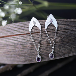 Długie, delikatne kolczyki wykonane od podstaw ręcznie ze srebra próby 999 i 925. Na łańcuszkach zawieszone zostały kamienie pięknego ametystu o przejrzystej, a jednocześnie intensywnej barwie. Zawieszone na sztyftach.