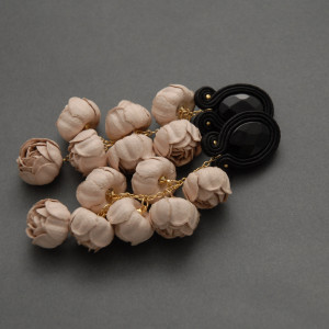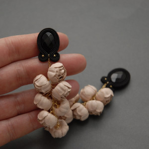oferuję kolczyki lub klipsy zrobione haftem sutasz, ozdobione fasetowanymi onyksami, koralikami i drobnymi kwiatkami