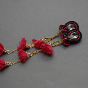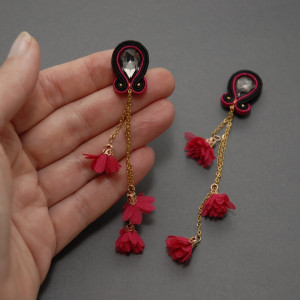 oferuję kolczyki zrobione haftem sutasz, ozdobione fasetowanymi szklanymi kaboszonami i delikatnymi kwiatuszkami z materiału