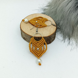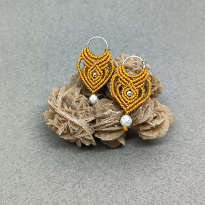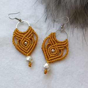 Eleganckie kolczyki w stylu etnicznym w kolorze musztardowym wykonane są metodą makramową ze sznurka wysokiej jakości, który jest przystosowany do wyrobu tego rodzaju biżuterii. Jest mocny i trwały a wyroby z niego nie zmieniają ani swojej pierwotnej formy ani koloru. Kolczyki zawieszone są na okrągłej bazie i biglach ze stali szlachetnej. Ozdobne kulki są z hematytu. Pasują do każdej stylizacji. Długość kolczyka z biglem ok. 7 cm, szerokość 3 cm. Pakowane w pudełko więc mogą być również prezentem