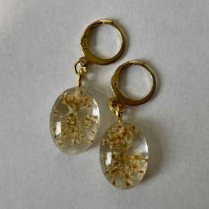 Kolczyki z kwiatami dzikiej marchwi na biglach ze stali szlachetnej w kolorze złotym.