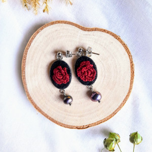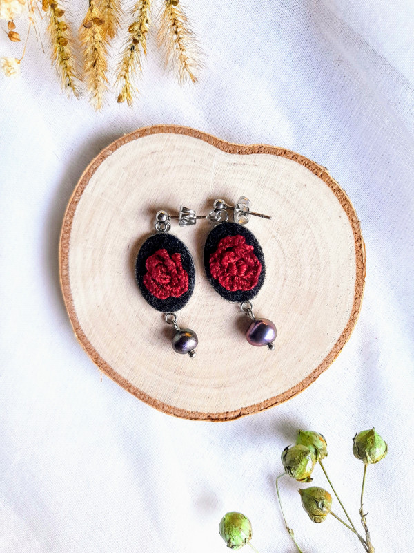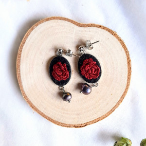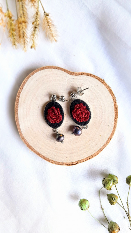 Delikatne, lekkie, haftowane ręcznie kolczyki z przestrzennymi różami w ciemnym bordo dla wielbicielek niepowtarzalnej kwiatowej biżuterii. Czarne tło podkreśla piękny, głęboki kolor wyszywanego kwiatu, a sztyfty z kulką bezpiecznie utrzymują kolczyki w uchu i nie ma obawy o ich zgubienie. Elegancji dodają jeszcze opalizujące ciemne perły. W takich kolczykach można się poczuć naprawdę wyjątkowo.