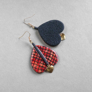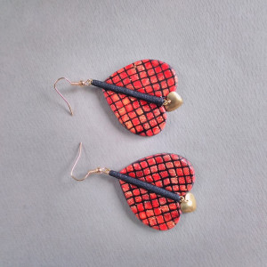 Wiszące kolczyki w odcieniach czerwieni i czerni, wykonane ręcznie wg autorskiego projektu. Elementy metalowe w kolorze złotym. Powierzchnia kolczyków jest wykończona na wysoki połysk, spód matowy, fakturowany. Wewnątrz zatopione są drobinki metalu. Wzór kratki nie jest namalowany, powstał poprzez nakładanie warstw gliny polimerowej.