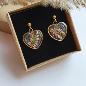 Kolczyki serca z żywicy z kwiatami wrzosa