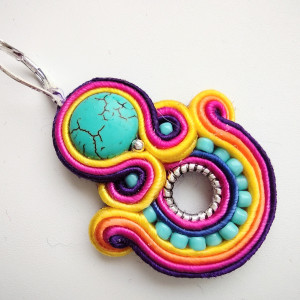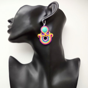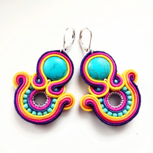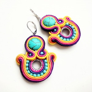 Kolczyki wykonane w technice haftu sutaszowego - szyje się kolorowe sznureczki milimetr po milimetrze, wszywając między nie kamienie i minerały, szkło itp.
