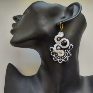 Kolczyki wykonane w technice haftu sutaszowego - szyje się kolorowe sznureczki milimetr po milimetrze, wszywając między nie kamienie i minerały, szkło itp.