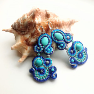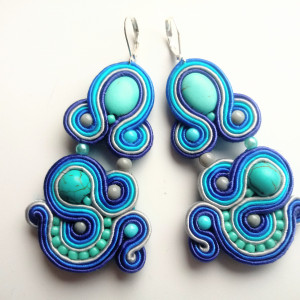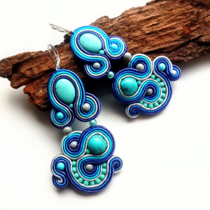 Materiał: sutasz, szkło, turkusowe howlity, japońskie koraliki Toho.