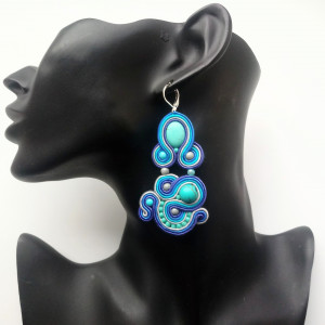 Kolczyki wykonane w technice haftu sutaszowego - szyje się kolorowe sznureczki milimetr po milimetrze, wszywając między nie kamienie i minerały, szkło itp.