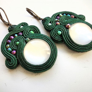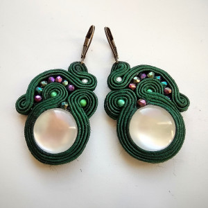 Kolczyki wykonane w technice haftu sutaszowego - szyje się kolorowe sznureczki milimetr po milimetrze, wszywając między nie kamienie i minerały, szkło itp.