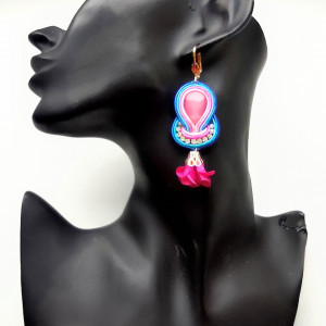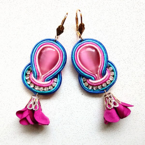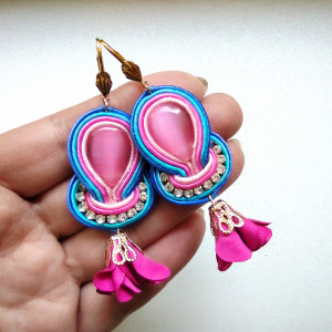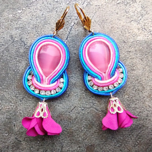 Kolczyki wykonane w technice haftu sutaszowego - szyje się kolorowe sznureczki milimetr po milimetrze, wszywając między nie kamienie i minerały, szkło itp.