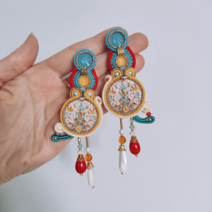 Duże i okazałe, bardzo kolorowe kolczyki sutasz z mojej mini kolekcji La Dolce Vita. Wykonane przy użyciu kunsztownych, ręcznie malowanych kaboszonow sprowadzonych od włoskiej artystki. Całości dopełniają kolorowe kryształki oraz masa perłowa. Kolczyki są długie, ale lekkie i zawieszone na sztyftach ze stali chirurgicznej.