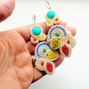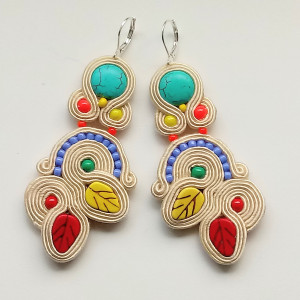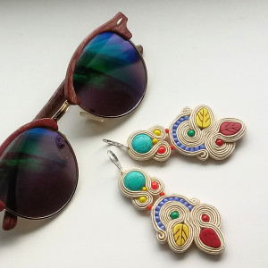 Kolczyki wykonane w technice haftu sutaszowego - szyje się kolorowe sznureczki milimetr po milimetrze, wszywając między nie kamienie i minerały, szkło itp.