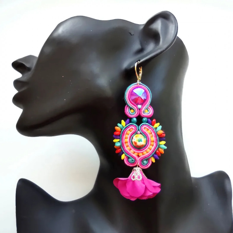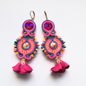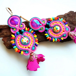 Długość kolczyków - 6 cm część sutaszowa+ 2.5 cm kwiatek satynowy.
