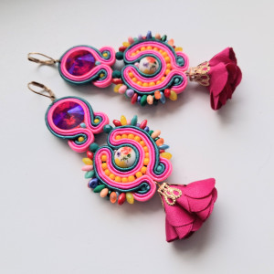 Kolczyki wykonane w technice haftu sutaszowego - szyje się kolorowe sznureczki milimetr po milimetrze, wszywając między nie kamienie i minerały, szkło itp.