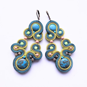 Kolczyki wykonane w technice haftu sutaszowego - szyje się kolorowe sznureczki milimetr po milimetrze, wszywając między nie kamienie i minerały, szkło itp.