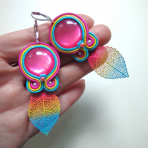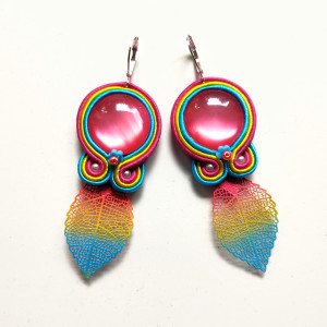 Kolczyki wykonane w technice haftu sutaszowego - szyje się kolorowe sznureczki milimetr po milimetrze, wszywając między nie kamienie i minerały, szkło itp.