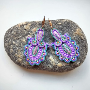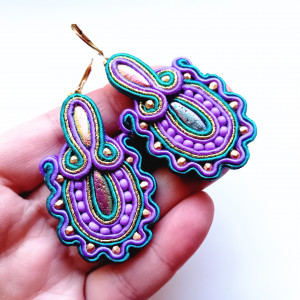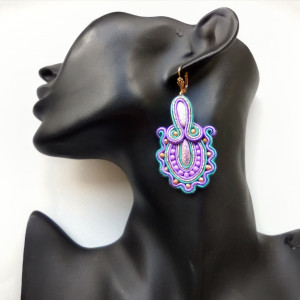 Kolczyki wykonane w technice haftu sutaszowego - szyje się kolorowe sznureczki milimetr po milimetrze, wszywając między nie kamienie i minerały, szkło itp.