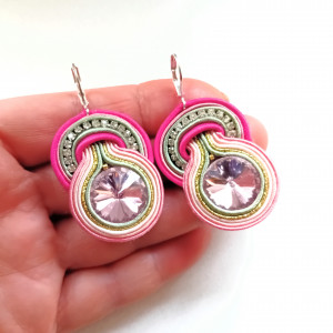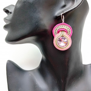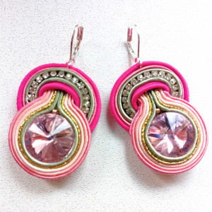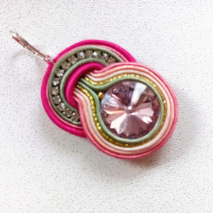 Kolczyki wykonane w technice haftu sutaszowego - szyje się kolorowe sznureczki milimetr po milimetrze, wszywając między nie kamienie i minerały, szkło itp.