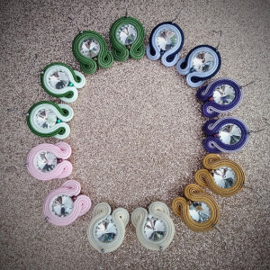 Biżuteria sutasz jest bardzo oryginalna. Jest to biżuteria dla osób ceniących sobie przedmioty wykonane w całości ręcznie, dla osób mających swój niepowtarzalny styl. Biżuteria mojego autorstwa jest zaprojektowana i wykonana z dbałością o każdy szczegół. Jeżeli lubisz otaczać się przedmiotami wyjątkowymi, rzucającymi się w oczy to zapraszam Cię do mojego sklepu. Te kolczyki są jedną z najbardziej stonowanych wersji sutaszu. Jeżeli szukasz czegoś bardziej kolorowego lub w jednym kolorze, efektownego a może ekstrawaganckiego bo taki jest właśnie Twój styl, to spójrz na inne moje oferty.