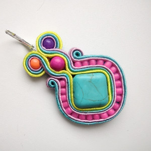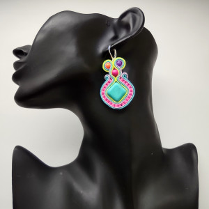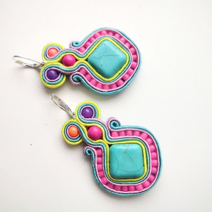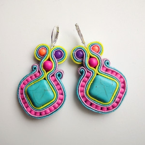 Kolczyki wykonane w technice haftu sutaszowego - szyje się kolorowe sznureczki milimetr po milimetrze, wszywając między nie kamienie i minerały, szkło itp.