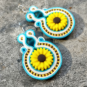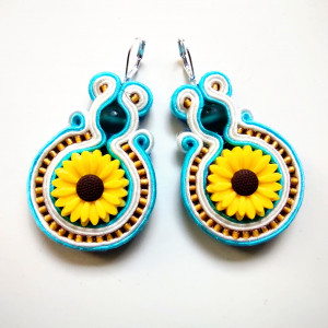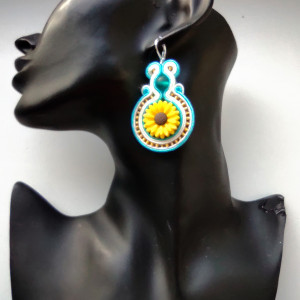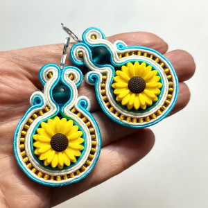 Kolczyki wykonane w technice haftu sutaszowego - szyje się kolorowe sznureczki milimetr po milimetrze, wszywając między nie kamienie i minerały, szkło itp.